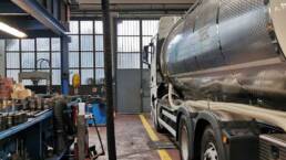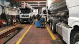 Linea di revisione composta da fossa prefabbricata da 7, 1 mt a normativa UNI 9721 con copertura motorizzata della portata di 15.000 Kg/m2 e banco prova organi di sterzo autocarri integrato AHS Prüftechnik GST 1501.3. Disponiamo del banco prova freni conforme alle attuali normative in vigore e di tutta la strumentazione connessa alla revisione ministeriale: dispositivo contagiri per test motore, apparecchiatura di controllo dei gas di scarico, fonometro e centrafari omologato.